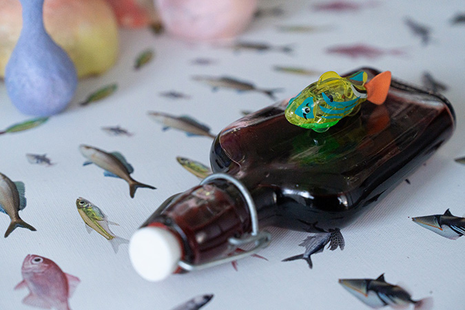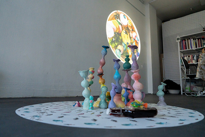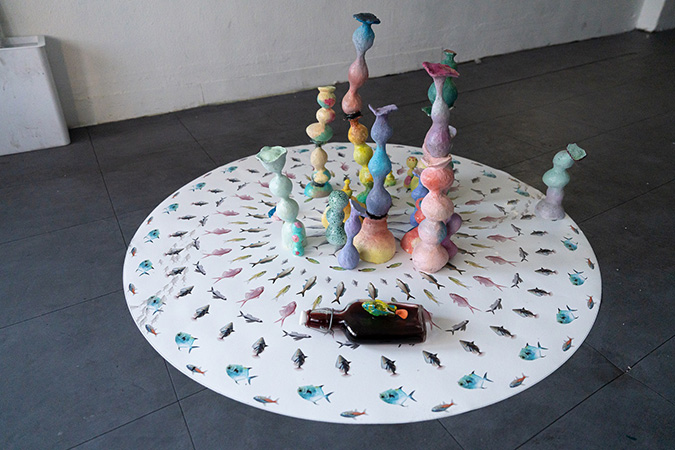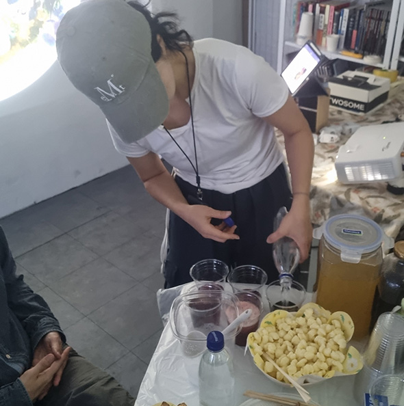 마지막으로 네오는, 다시 이번 전시 내 이미정에게로 돌아가 창작의 세계에 대해 묻는다. 그것은 오프닝 세레모니에서 꺼낸, 그가 빚은 술에서 어떤 세계로 재탄생하는 것이다. 작가에게 술 빚기란, 처음 논의 과정에서는 창작에서 벗어나는 어떤 도피행위처럼 소개가 되었다. 그러나 내 생각은 달랐다. 그것이야말로 또 다른 창작의 한 일환이며 동시에 법적으로 성인이 되었기에 가능한 창작이기도 하다. 네오는 어린아이들이 가지고 노는 플라스틱 장난감이 아닌, 성인이 된 작가를 통해 좋아하는 과일로 담근 술이 되어 관객들에게 다시 전달되는 것이다. 오프닝 세레머니에서 그 술을 마시며, 어릴 때 잡던 붓에서 시작한 창작이 성인이 되어 알콜을 통해 발현되는 것은 아닐까 우스개 소리를 해보았다. 술잔 안에서 네오는 또 유유히 헤엄을 치고 있으리라. 그렇게 반복되는 상상의 나래들이다.