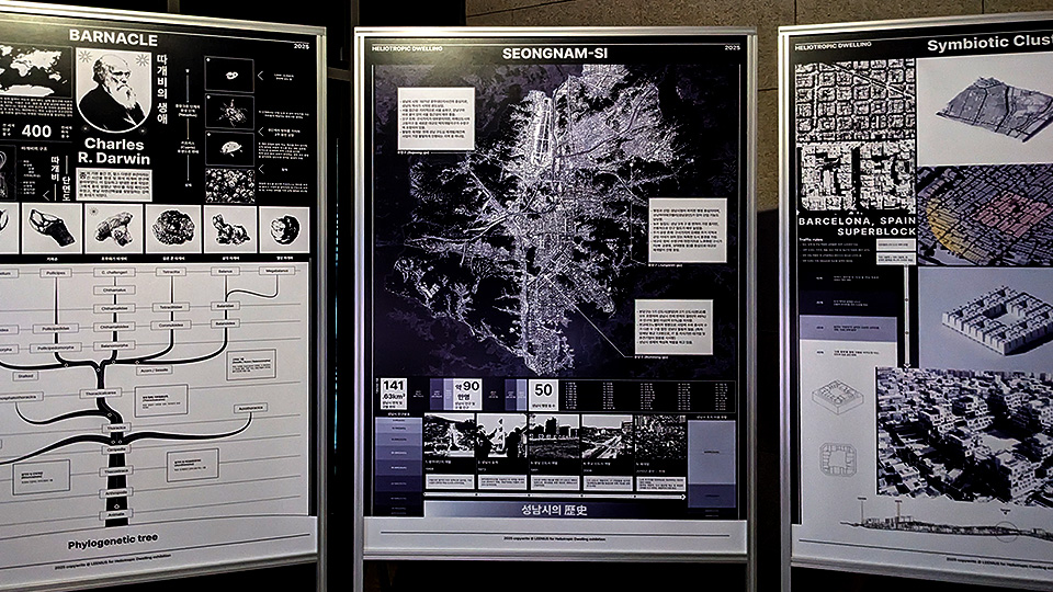 전시장 한쪽에는 따개비의 생태와 도시 군락의 새로운 건축 양식을 상상하는 아카이브가 전시되어 있으며, 성남 구도심의 형성과 군락의 세계관을 설명하는 비디오가 상영되고 있다.