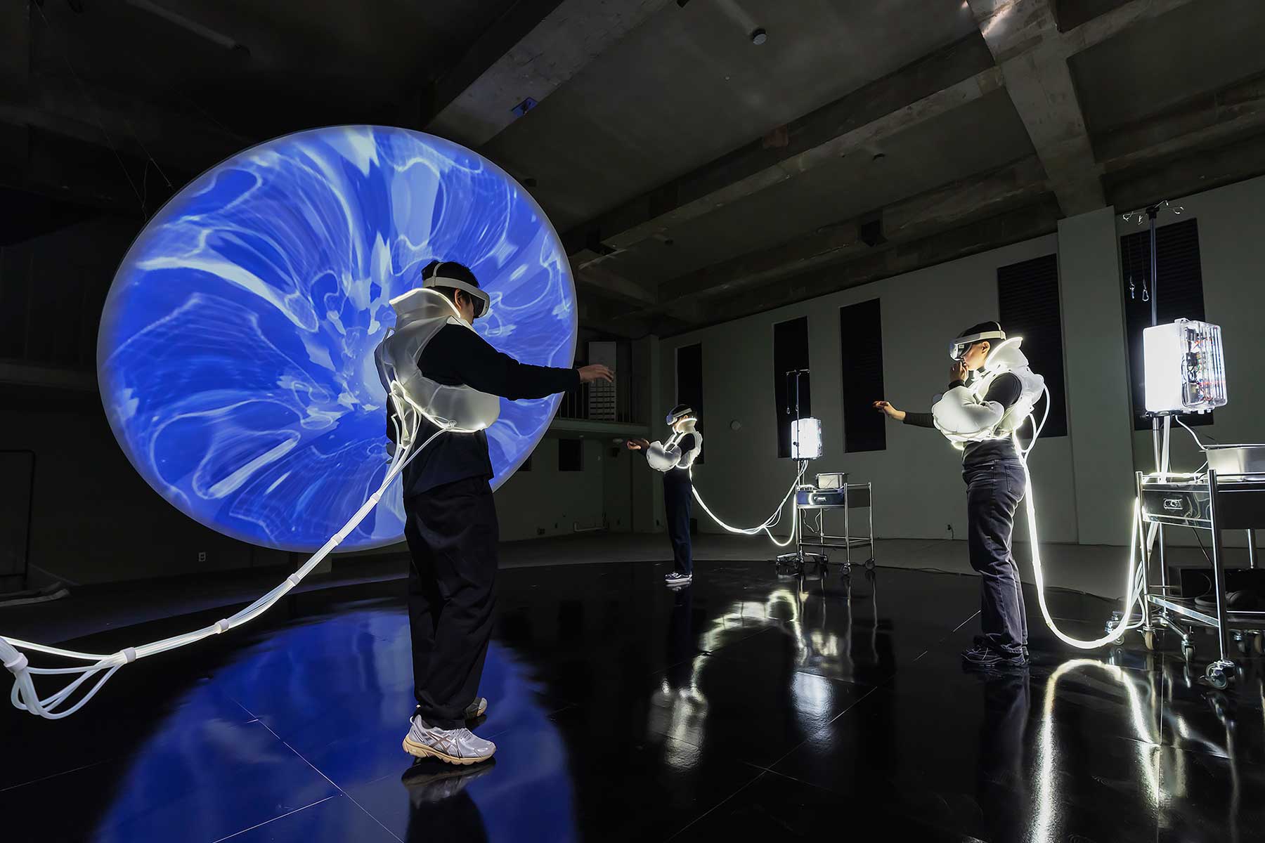 서늘하고 천장이 높은 어두운 전시장에 들어서면 푸른빛을 띤 거대한 원판이 공간 전체를 내려다보는 광경과 마주하게 된다. 그 아래에는 미래의 병원 장비를 연상시키는 기기들에 연결된 반투명한 공기 충전식 의상들이 세워져 있으며, 각 의상에는 LED 조명이 은은하게 빛난다. 이 장비들은 가상 세계로 접속하기 위한 장치이다. 거대 원판의 표면에는 저쪽 세계의 잔상처럼 보이는 영상이 흐르고 있다. 안내원들의 지시에 따라 장치를 착용하고 옷을 몸에 맞춰 고정한 뒤 신호를 기다리면 곧 ‘저쪽 세계’로 다이브 하는 접속 절차가 시작된다.