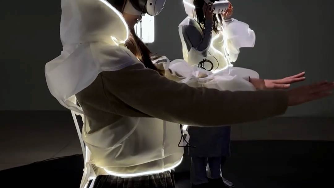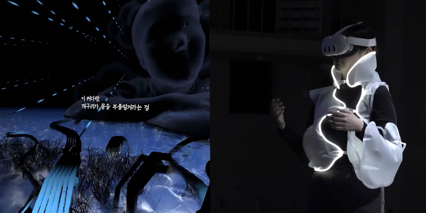이야기를 계속 따라가면 주인공이 데이터의 바다에서 ‘너의 조각’을 찾기 위해 스스로를 업로드하기 시작했다는 것을 알게 된다. 이제 주인공에게는 거대한 데이터 우주를 헤매는 일이 일상의 일부가 되었고, 몸이 비어가는 순간마다 관객이 착용한 의상은 공기를 채우며 팽창한다. 내부가 빠져나간 자리와 맞물려 부풀어 오르는 압력이 몸 전체를 외부에서부터 압박한다.